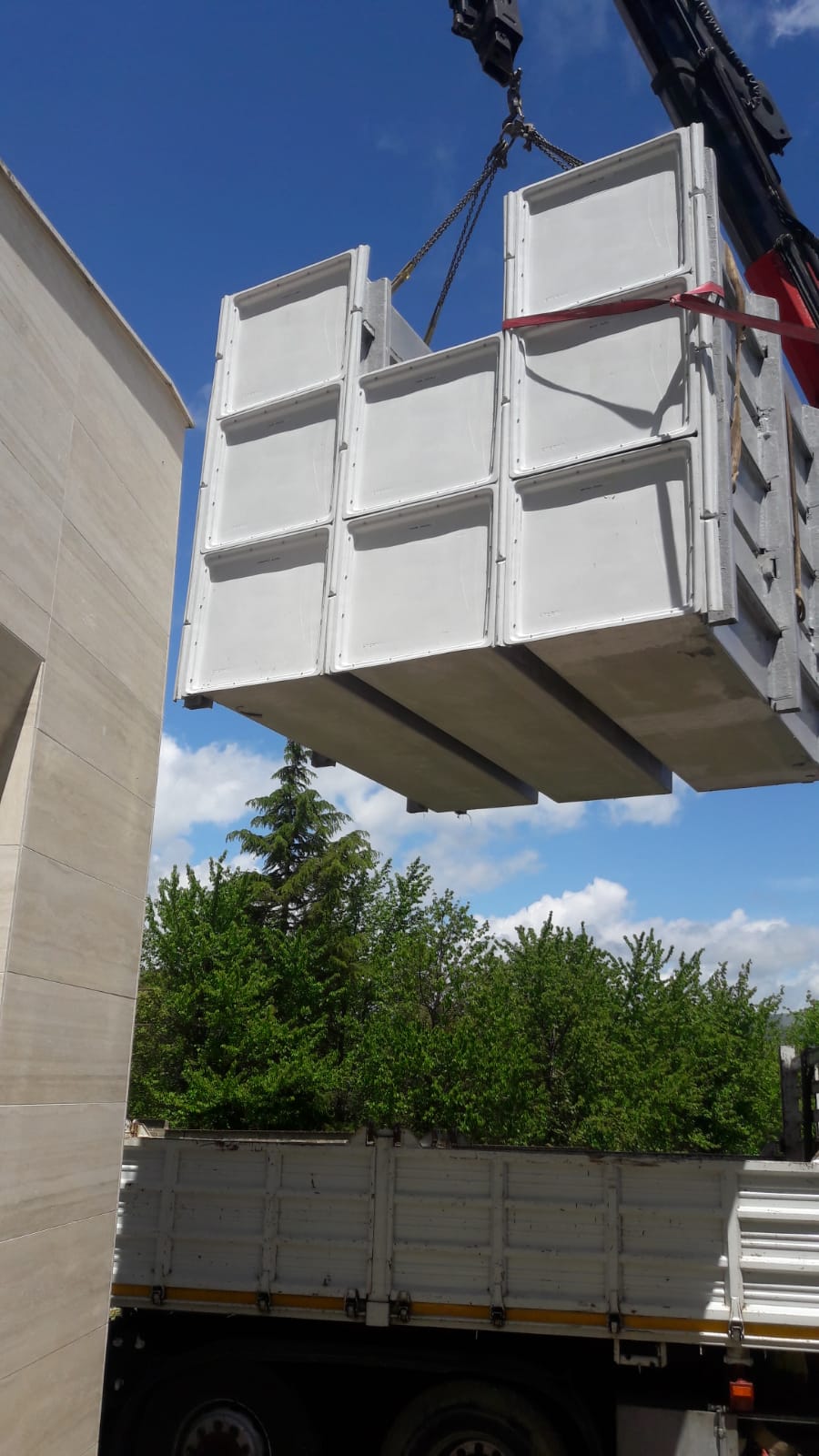 Il sistema di loculi è stato studiato per eseguire lavori di stumulazione dalla cappella esistente in cemento danneggiata dal terremoto. Le fasi di lavorazione eseguite hanno permesso di stumulare e riposizionare la struttura definitiva su basamento dopo la demolizione della vecchia cappella, senza riesumazione delle salme.